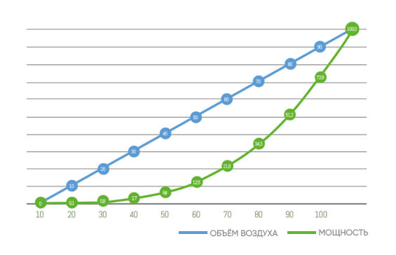 Чтобы было более понятно, какой экономии можно достичь, необходимо знать, что соотношение между скоростью вращения вентилятора, давлением в воздуховоде и мощностью двигателя не является прямым. Оно соответствует закону куба: т.е., изменяя во сколько-то раз скорость вращения вентилятора, давление изменяется в n в квадрате раз, а мощность в n в кубе раз. Зависимость между объемом воздуха (скорость вращения вентилятора) и энергопотреблением двигателя представлена ниже.