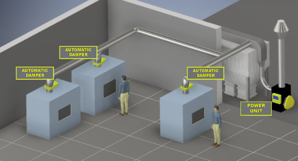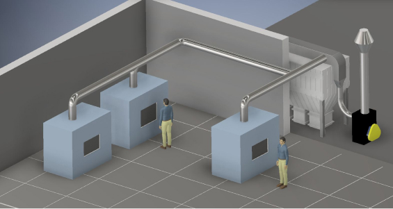 К центральному фильтру подключен один большой вентилятор, соединенный с главным воздуховодом, который, в свою очередь, разветвляется к каждому источнику для удаления пыли на производстве.